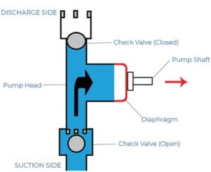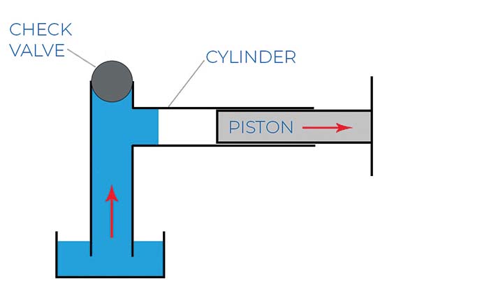 以同樣的方式,泵中的隔膜向泵體內(nèi)和向外移動,與止回閥一起工作以吸入和排出泵中的流體。下面的圖 2 顯示,如果沒有止回閥,當(dāng)活塞向外移動時,空氣會簡單地流入氣缸,從而阻止任何吸入。