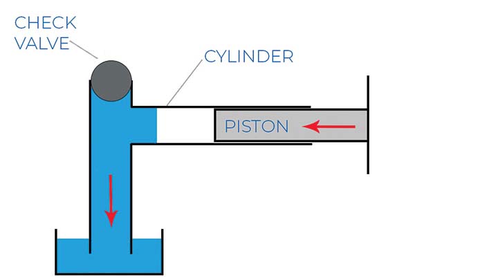 圖 3 顯示了用于防止流體流入氣缸的止回閥。這會在氣缸內(nèi)產(chǎn)生負(fù)壓,一旦活塞向外移動,就可以從底部吸取流體。
